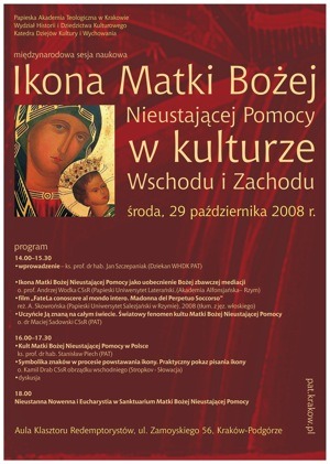 W środowe popołudnie 29.10. br. w auli klasztoru redemptorystów w Krakowie miała miejsce międzynarodowa sesja naukowa na temat: Ikona Matki Bożej Nieustającej Pomocy w kulturze Wschodu i Zachodu. Sypozjum to, zorganizowane z inicjatywy Katedry Dziejów Kultury i Wychowania Papieskej Akademii Teologicznej w Krakowie, miało na celu ukazanie wyjątkowego charakteru kultu, telogii i historii Ikony MBNP, którą z woli bł. papieża Piusa IX od 1866 roku opiekują się redemptoryści.